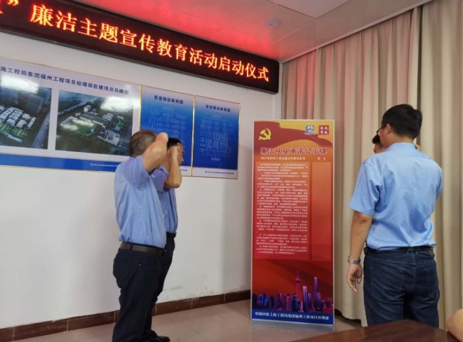 福州工程項目開展“清風市政”廉潔主題宣傳教育活動。67日下午,福州工程項目黨支部舉行第三屆企業文化節“清風市政”廉潔主題宣傳教育活動啟動儀式。會上,項目黨支部書記劉進春介紹了本項目的具體活動實施方案和工作部署,并對項目全體員工進行工作動員和提出要求。隨后,項目職工集體現場觀看《忠廉愛國,十代將門》廉政文化教育片,以谷府折家“忠廉”家風為榜樣,引導大家從自身做起,重視家風建設,樹立忠于國家、以廉為榮的價值觀。最后,項目領導班子成員進行了廉潔從業公開承諾,并依次在承諾公示牌上進行簽名,紛紛表示將自覺踐行廉潔從業承諾內容,堅持遵規守紀、廉潔從業,為全體職工做好“忠廉”表率。(王迪)