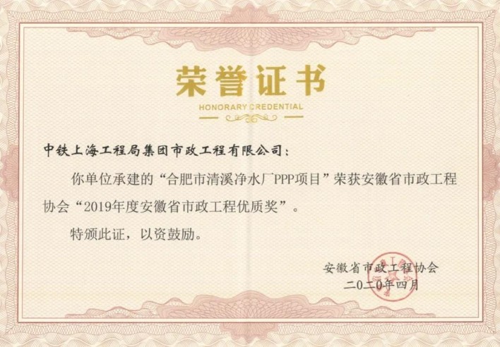近日,安徽省市政協(xié)會傳來喜訊,公司承建的合肥市清溪凈水廠PPP項目榮獲安徽省“市政工程優(yōu)質(zhì)獎”。