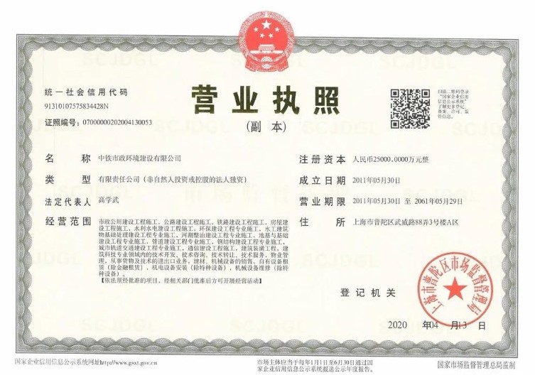 看著剛剛領回的新企業營業執照,輕輕地讀著,“名稱:中鐵市政環境建設有限公司”,我心中不禁感慨萬千:工作30年來,公司五易其名,鐵道部第四工程局給排水工程處、中鐵四局給排水工程公司(分公司)、中鐵四局市政工程分公司、中鐵上海工程局集團市政工程有限公司、中鐵市政環境建設有限公司,一個個響亮的名字,見證著公司跌宕起伏、昂揚奮進的成長與發展,更見證著公司隨著市場經濟大潮在水務環保施工領域的興起與壯大。