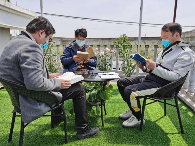 武漢北湖污水處理廠項目在會議室組織開展薦書贈書暨讀書心得體會交流會活動。圖為項目員工在駐地“思源亭”品讀書香。