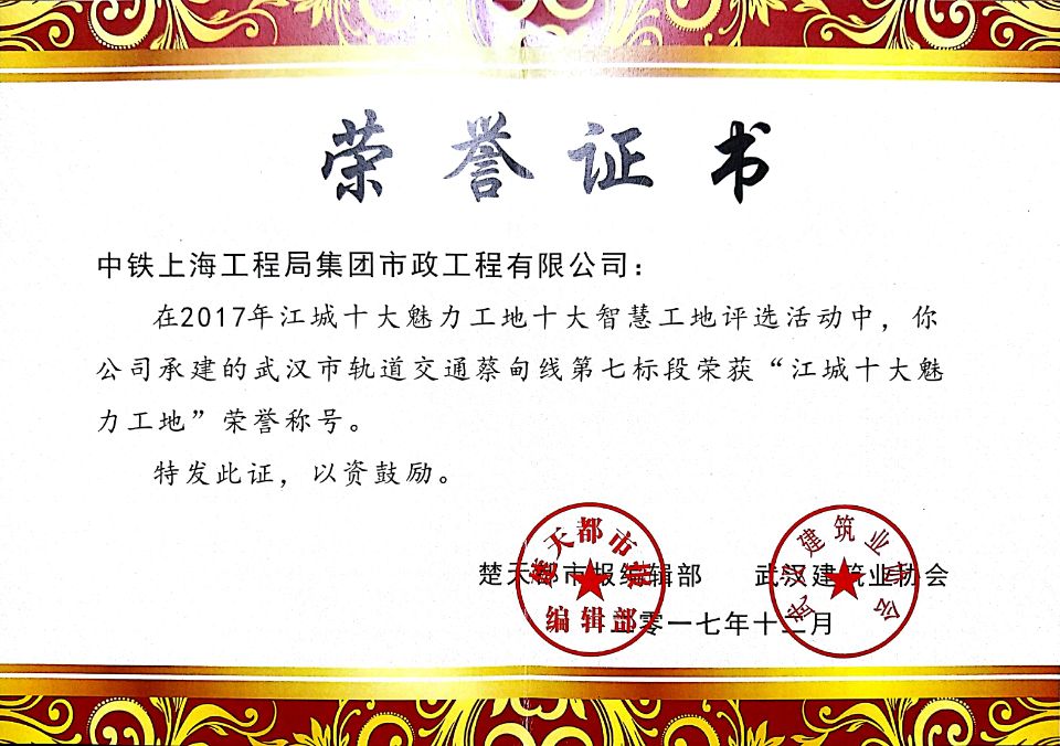 1月7日,江城“十大魅力工地”“十大智慧工地”頒獎(jiǎng)儀式在武漢市楚天傳媒大廈楚天會(huì)堂隆重舉行。由市政公司承建的武漢市軌道交通蔡甸線第七標(biāo)段項(xiàng)目喜獲“十大魅力工地”稱號,這也是中鐵上海局自進(jìn)入武漢市場以來首次獲得該項(xiàng)榮譽(yù)。